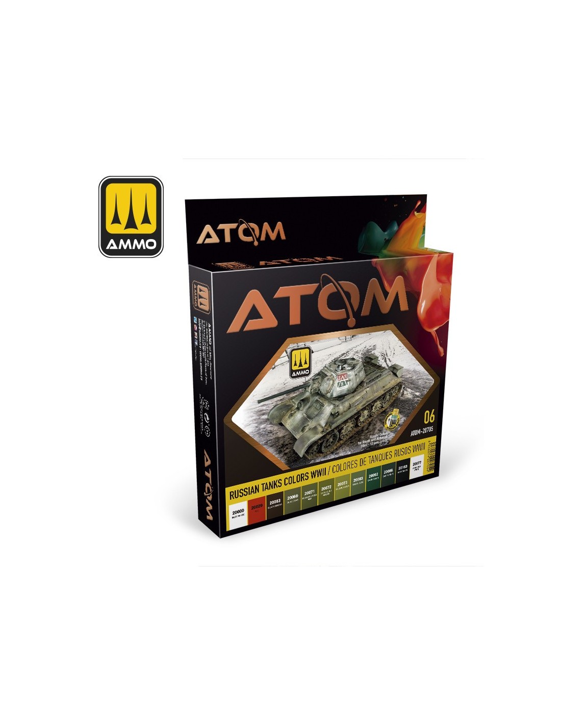 Set de 12 colores ATOM con base al agua, de alta calidad y especialmente seleccionados para representar la pintura utilizada en los carros de combate y otros vehículos soviéticos durante la II Guerra Mundial.