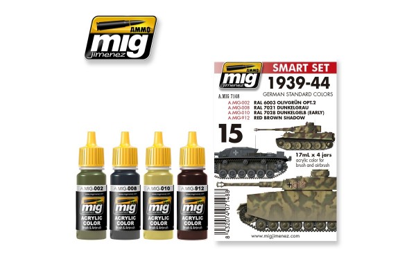 A diferencia de los que muchos modelistas creían, los colores alemanes no fueron los mismos durante toda la guerra mundial. Algunos colores fueron cambiando y modificándose a lo largo de la guerra, como por ejemplo el famoso Dunkelgelb o “Dark Yellow”. También el Olivgrün fue sufriendo variaciones. Este set incluye los cuatro colores más comunes usados entre 1939 y 1944, permitiéndonos obtener el mayor realismo con los colores más exactos, resultado de años de investigación profesional. Los cuatro colores son pintura acrílica con una formula optimizada para obtener el máximo rendimiento tanto con pincel como con aerógrafo y con Efecto de Reducción de Escala que nos permitirá conseguir el color adecuado en nuestras maquetas. Cada bote incluye un agitador de acero inoxidable para facilitar una mezcla más rápida y homogénea. Presentación en botes de 17ml. Soluble en agua, sin olor y no tóxico. Agite bien antes de cada uso. Recomendamos A.MIG-2000 Acrylic Thinner para una correcta disolución en caso de ser necesaria. Secado completo en 24h.