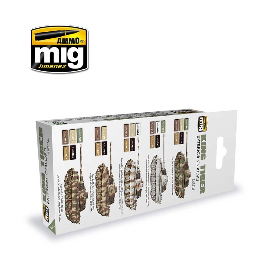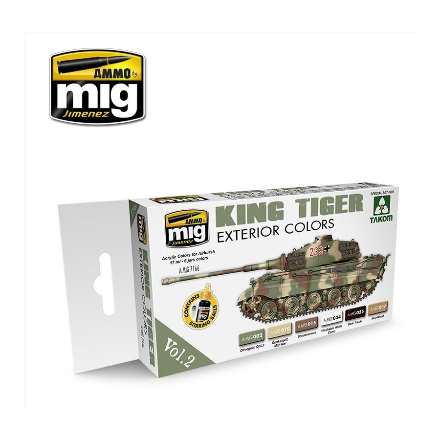 Este set incluye los colores necesarios y exactos para pintar los exteriores de un King Tiger incluidos sus característicos colores. Desde el característico color base Dunkelgelb y los colores de camuflaje marron y verde, hasta el color para las herramientas y orugas, pasando la pintura blanca lavable para hacer camuflajes invernales. Aunque el set es una edición especial para los King Tiger de la marca Takom, sirve para pintar cualquier otro King Tiger y muchos otros tanques alemanes de final de guerra. Los 6 colores están formulados para obtener el máximo rendimiento tanto con pincel como con aerógrafo y con Efecto de Reducción de Escala que nos permitirá conseguir el color adecuado en nuestras maquetas. Cada bote incluye un agitador de acero inoxidable para facilitar una mezcla más rápida y homogénea. Presentación en botes de 17mL. Soluble en agua, sin olor y no tóxico. Agite bien antes de cada uso. Recomendamos A.MIG-2000 Acrylic Thinner para una correcta disolución. Secado completo en 24h.