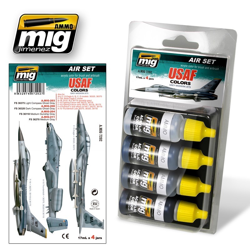 Pinturas acrílicas de alta calidad con referencias de FEDERAL STANDARD para aviación. Este pack de 4 colores incluye los colores grises más comunes de la USAF en sus aviones. Esto incluye todos los F-15, los F-16 early de tres tonos, los F-4 Phantom II en esquema Hill 1… etc. Los colores están basados en las referencias de FEDERAL STANDARD y son colores exactos, aunque ligeramente aclarados para compensar el Efecto Escala de cualquier maqueta. Esta pintura presenta una formula optimizada para obtener el máximo rendimiento tanto con pincel como con aerógrafo. 4 colores en envases de 17mL. Agite bien antes de cada uso. Cada bote incluye un agitador de acero para facilitar el mezclado de la pintura. Soluble en agua, sin olor y no tóxico. Recomendamos A.MIG-2000 Acrylic Thinner para una correcta disolución. Secado completo en 24h. Incluye los colores: