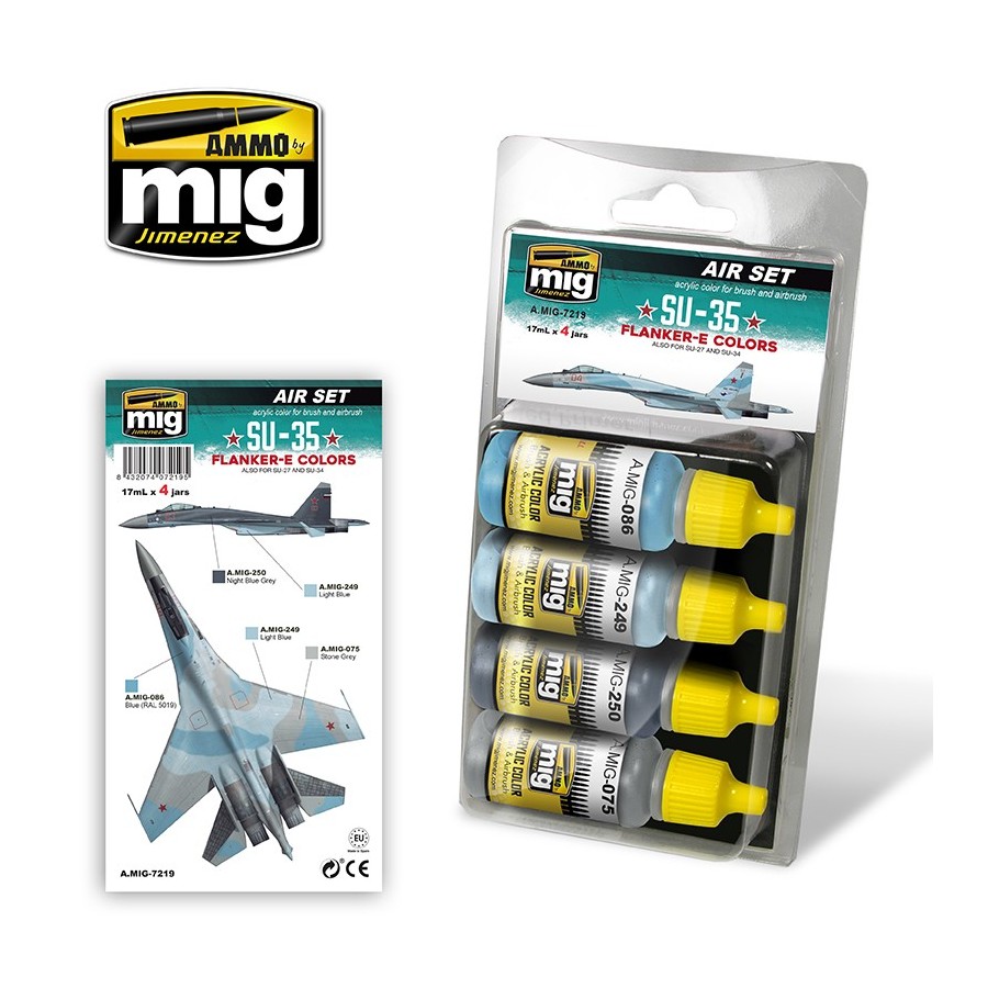 Pinturas acrílicas de alta calidad para aviación. Este pack incluye los colores necesarios para pintar los principales esquemas utilizados por los Su-35 rusos. Además, también pueden ser empleados algunos de ellos para los Su-34 y otros aparatos de la familia Sukhoi. Los colores son exactos, aunque ligeramente aclarados para compensar el Efecto Escala de cualquier maqueta. Esta pintura presenta una fórmula optimizada para obtener el máximo rendimiento tanto con pincel como con aerógrafo. 4 colores en envases de 17ml. Agite bien antes de cada uso. Cada bote incluye un agitador de acero para facilitar el mezclado de la pintura. Soluble en agua, sin olor y no tóxico. Recomendamos A.MIG-2000 Acrylic Thinner para una correcta disolución. Secado completo en 24h.