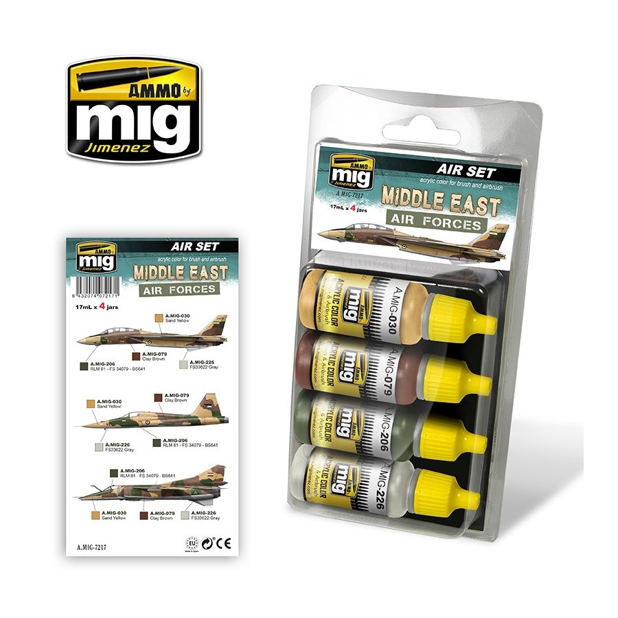 Pinturas acrílicas de alta calidad. Este pack incluye 4 colores necesarios para decorar aparatos de fuerzas aéreas de Oriente Medio, incluyendo países como Irán, Irak y Jordania, entre otros. En cuanto a los aparatos podremos pintar F-4 Phantom, F-5 Tiger, F-14 Tomcat, Mig-23, Su-25, Tucano, e incluso helicópteros como el AH-1 Cobra. Los colores están basados en las referencias de FEDERAL STANDARD y son colores exactos, aunque ligeramente aclarados para compensar el efecto escala de cualquier maqueta. Esta pintura presenta una fórmula optimizada para obtener el máximo rendimiento tanto con pincel como con aerógrafo. 4 colores en envases de 17mL. Agite bien antes de cada uso. Cada bote incluye un agitador de acero para facilitar el mezclado de la pintura. Soluble en agua, sin olor y no tóxico. Recomendamos A.MIG-2000 Acrylic Thinner para una correcta disolución. Secado completo en 24h.