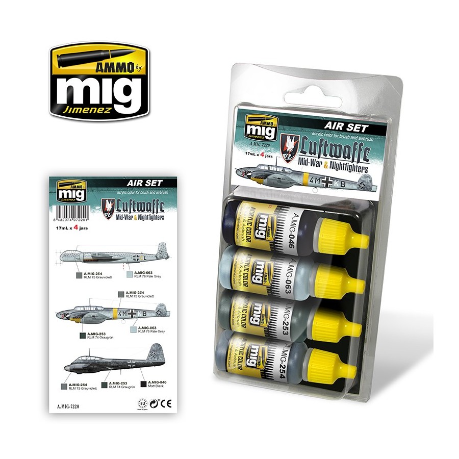 Pinturas acrílicas de alta calidad especialmente pensadas para representar los camuflajes empleados por la Luftwaffe durante los años intermedios de la Segunda Guerra Mundial, así como en aviones de caza nocturna. Con estos colores podremos pintar la mayoría de los aviones que actuaron en este periodo, desde los conocidos Bf 109, Bf 110 y Fw 190 a los cazas nocturnos como el He 219 o Me 410. Este set resuelve los problemas a la hora de elegir los colores para nuestros modelos, ahorrando un tiempo valioso. Los tonos son exactos, aunque ligeramente aclarados para compensar el efecto de escala en cualquier maqueta. Esta pintura presenta una fórmula optimizada para obtener el máximo rendimiento tanto con pincel como con aerógrafo. Cuatro colores en envases de 17ml. Agite bien antes de cada uso. Cada bote incluye un agitador de acero para facilitar el mezclado de la pintura. Soluble en agua, sin olor y no tóxico. Recomendamos A.MIG-2000 Acrylic Thinner para una correcta disolución. Secado completo en 24h.