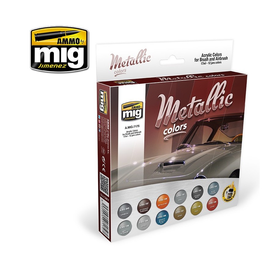 Especialmente ideado para poder pintar cualquier modelo en el que queramos simular colores metálicos. Este set exclusivo incluye doce tonos metalizados diferentes, perfectos para conseguir diversos matices en función del tipo de metal que queramos representar. Con estas pinturas podremos obtener los acabados más realistas en aviones, vehículos, naves, etc. Esto facilita la elección de los colores exactos. Cada bote incluye un agitador de acero inoxidable para facilitar una mezcla más rápida y homogénea. Presentación en botes de 17ml. Soluble en agua, sin olor y no tóxico. Agite bien antes de cada uso. Recomendamos A.MIG-2000 Acrylic Thinner para una correcta disolución. Secado completo en 24h.