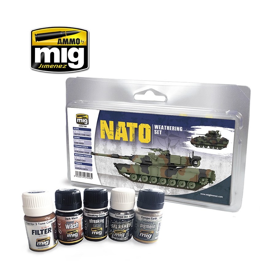 Set indispensable de envejecido y acabado para vehículos con esquemas de camuflaje OTAN. Incluye los productos más adecuados para esta tarea: un lavado, un escurrido, un filtro, un pigmento y un producto de salpicaduras de barro. Estas referencias se pueden utilizar para cualquier vehículo con el camuflaje estándar de tres tonos de la OTAN, elegidas especialmente para aplicarlas sobre estos colores y crear una amplia variedad de efectos y acabados realistas. Se pueden utilizar de forma individual o combinados.