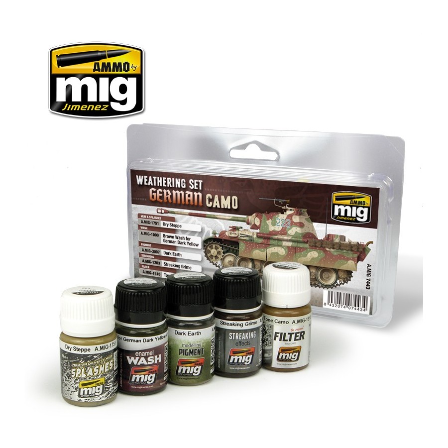 Set indispensables de envejecido y acabado para vehículos con esquemas de camuflaje alemán. Incluye los productos más idóneos para esta tarea tales como un lavado, un escurrido, un filtro un pigmento y un producto de salpicaduras de barro. Estos efectos se pueden utilizar para casi cualquier camuflaje alemán para crear una amplia variedad de efectos y acabadosrealistas. Se pueden utilizar de forma individual o en combinación para una gran variedad de efectos.