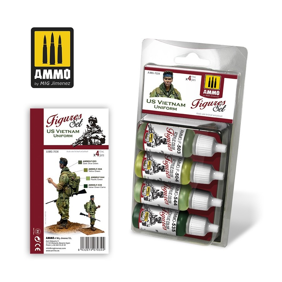 La gama de colores acrílicos para figuras ha sido diseñada para hacer de la pintura una actividad placentera por su rapidez y sencillez. Nuevos materiales para nuevas técnicas más accesibles a los aficionados al modelismo. Todos los colores de la gama se pueden mezclar entre sí y con el resto de colores acrílicos de AMMO. Se adaptan perfectamente a las técnicas tradicionales de pintura por capas o fundidos y a los nuevos procedimientos de técnica mixta. Son aptos tanto para el pincel como para aplicarlos a aerógrafo. Se disuelven en agua y están fabricados con ingredientes no inflamables ni perjudiciales para la salud.