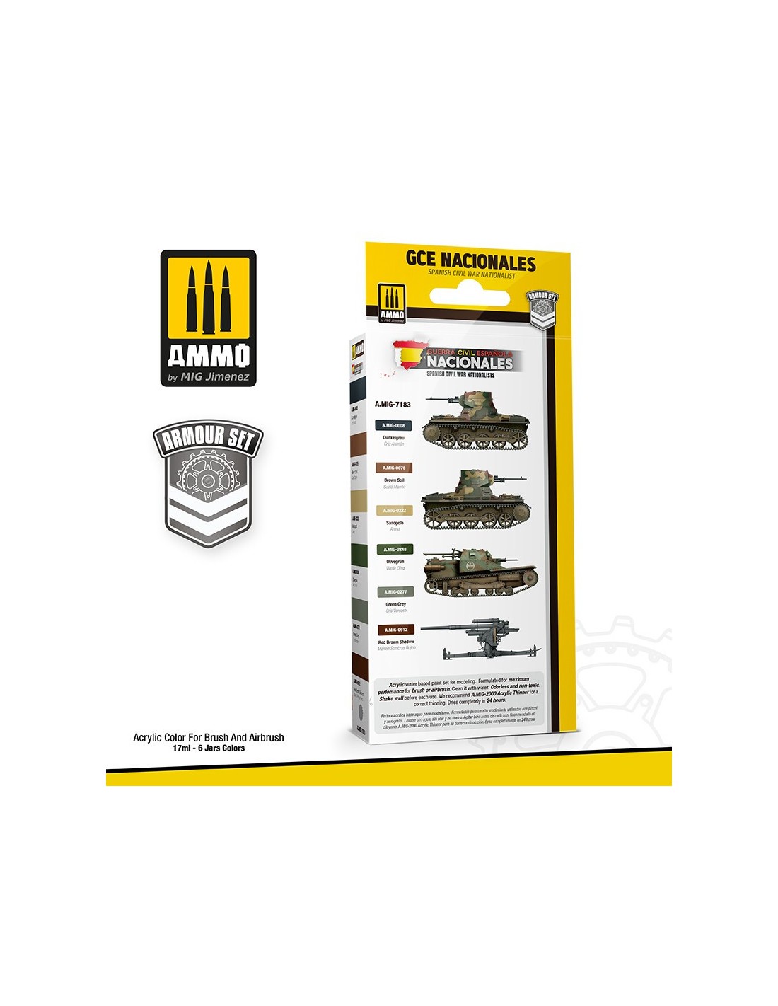 Esta selección de colores comprende el material cedido por Alemania e Italia al bando Nacional durante la guerra. Estos tonos te permitirán pintar de forma lógica y fácil todos los vehículos utilizados durante este conflicto. Además de los carros de combate, estos colores también se utilizaron para camuflar camiones blindados, motocicletas y piezas de artillería. La selección comprende los colores del material alemán e italiano suministrado al bando Nacional, así como los tonos de pintura más adecuados para decorar los kits en el mercado.