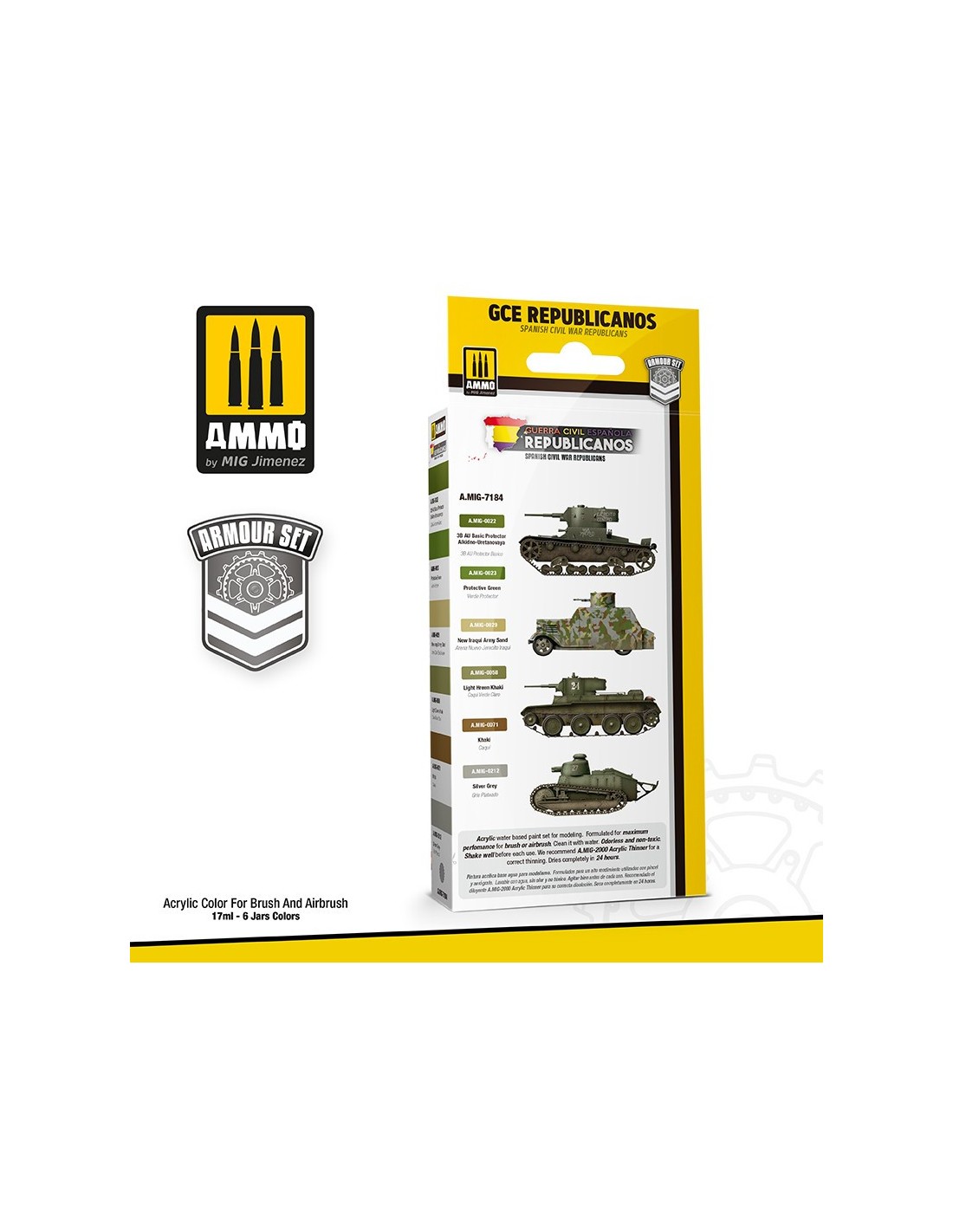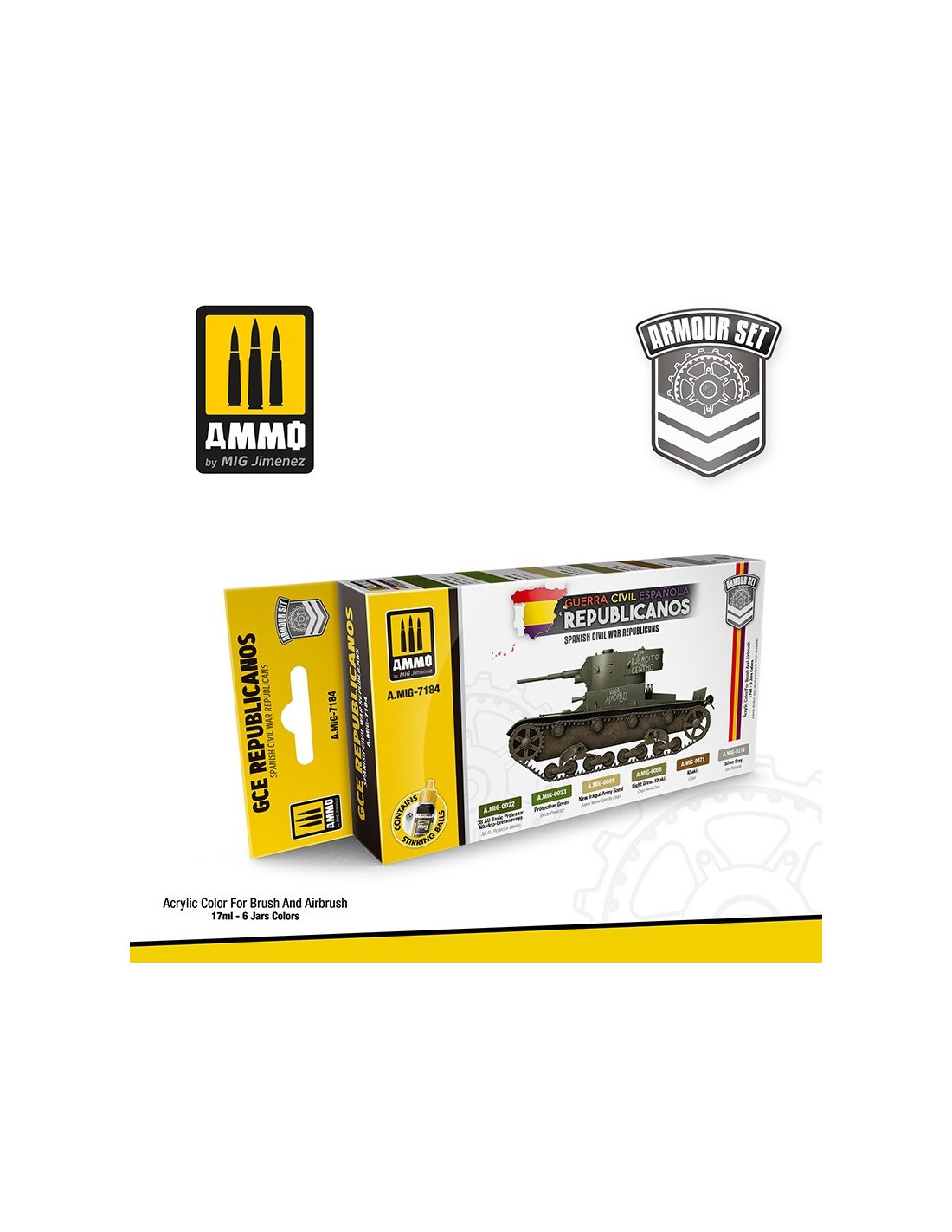 Esta selección de colores te permitirá pintar de forma lógica y fácil todos los vehículos utilizados por la Republica durante este conflicto. Además de los tanques, estos colores también se utilizaron para camuflar camiones blindados, motocicletas y piezas de artillería. La selección comprende los colores del material Soviético comprado por la Republica, así como los más utilizados para pintar el material bélico del ejército durante esta época.