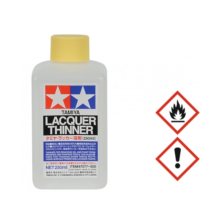 - Disovente Tamiya Lacquer Thinner de tipo universal en envase de 250 ml. Apto para pinturas esmalte o acrílicas. Para limpieza de superficies y disolución de masillas monocomponente putty.
