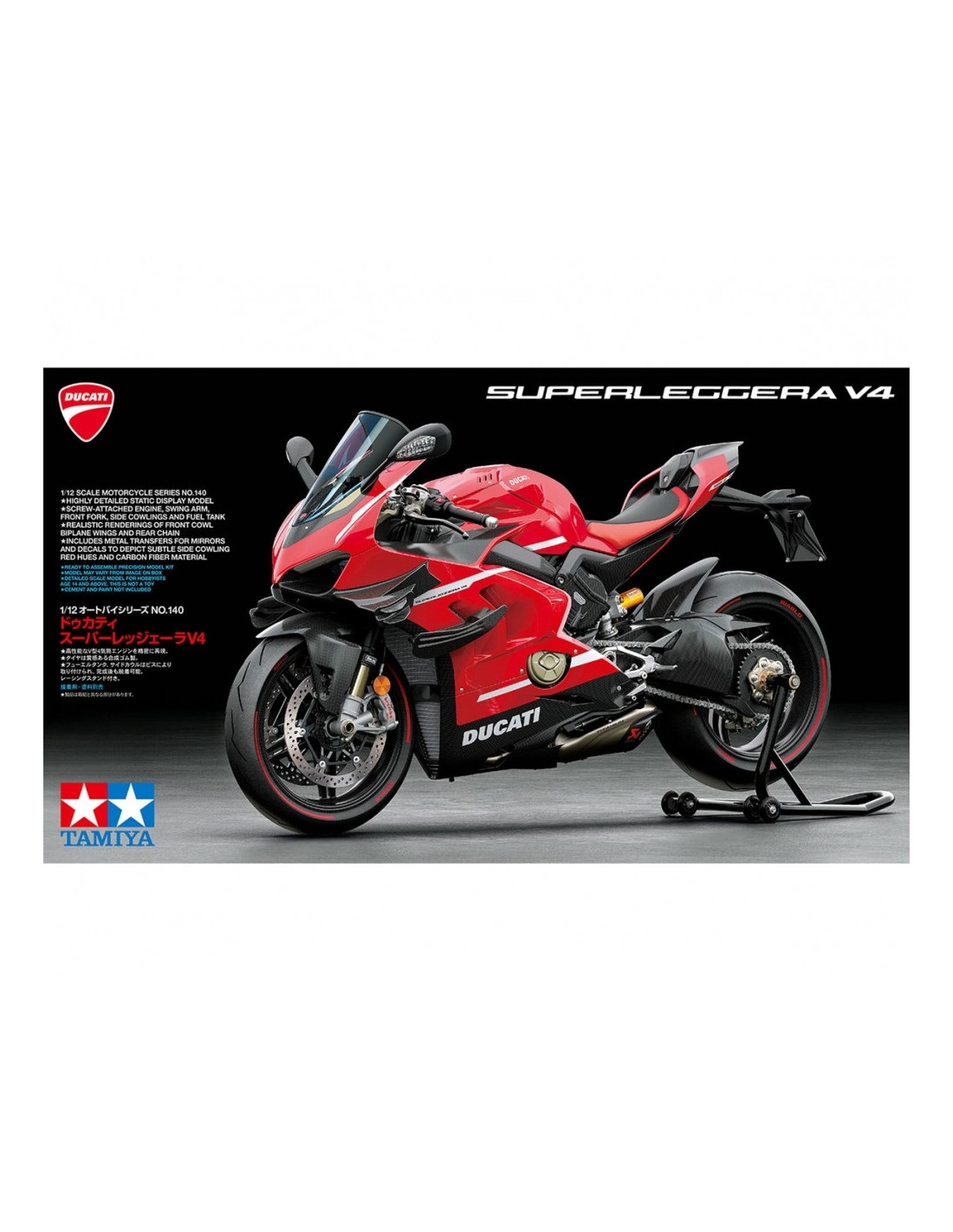 Tamiya se enorgullece de anunciar el lanzamiento de la Superleggera V4 como una nueva adición a nuestra serie de motocicletas 1/12. La Superleggera V4 es una versión homologada para carretera de la Panigale V4 producida por el legendario fabricante italiano de motocicletas, Ducati. La piedra angular de esta motocicleta es el aligeramiento facilitado por el material de fibra de carbono en los carenados, el chasis y el basculante, y su llamativo diseño cuenta con las distintivas alas biplano de fibra de carbono a ambos lados del capó delantero para la aerodinámica. El motor es la Desmosedici Stradale R, un V4 de 998 cc con el sistema de distribución desmodrómica de Ducati. Esta motocicleta también utiliza suspensiones Öhlins y sistema de frenos Brembo. Además, la instalación del silenciador de titanio Akrapovič -que es para el kit de competición- con una pieza de motor dedicada da como resultado una magnífica relación potencia/peso de 1,54 CV/kg. No pierda esta gran oportunidad de conseguir nuestro modelo de kit de montaje de esta rara supermoto; sólo se produjeron 500 de la motocicleta de tamaño completo.