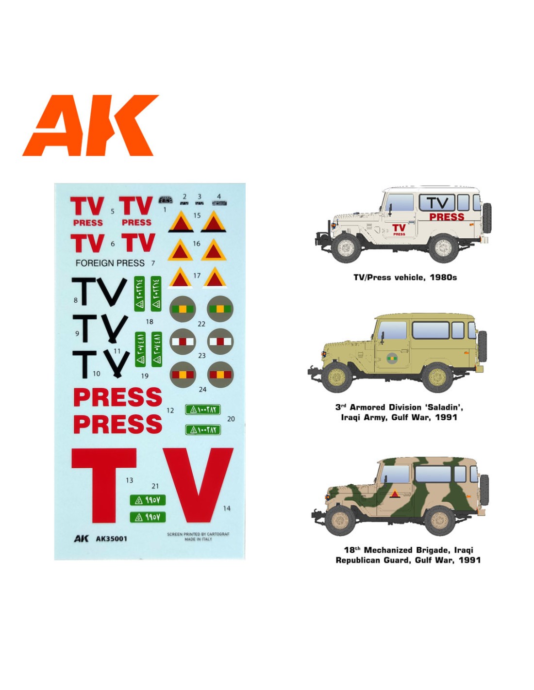 El AK35001 es la versión HardTop del vehículo, probablemente una de las variantes más populares en uso. La capota se podía quitar o poner fácilmente según las condiciones, pero era un elemento muy útil en condiciones de frío, lluvia o polvo, tanto para los usuarios militares como civiles a lo largo de las muchas décadas de servicio del vehículo. El modelista puede hacer diferentes cambios en el kit y variaciones fáciles para que coincida con diferentes configuraciones visto a través de los años en diferentes conflictos o versiones civiles. Es perfecto para construir out of box o para actualizar y adaptar a nuestra propia versión. Este kit permite multitud de posibilidades.